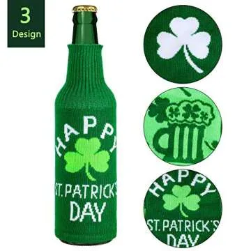 Show more Celebrate St. Patrick's Day in style with our festive St. Patrick's Day themed bottle sleeves! This vibrant package includes 6 pieces of reusable sleeves in 3 different styles, each beautifully adorned with traditional green shamrock patterns and the cheerful greeting, 'Happy St. Patrick's Day'. Perfect for giving your beverages a touch of holiday joy, these sleeves are a quick and easy way to elevate your holiday table setting.