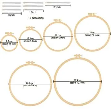 Show more Introducing the perfect accessory for embroidery enthusiasts, the high-quality plastic embroidery hoop set! This set includes six different sizes of hoops: 9.2 cm, 12.3 cm, 16 cm, 20 cm, 24.2 cm, and 27.1 cm, along with a bag of 16 needles to ensure you have everything you need to start your creative journey. Each hoop is crafted from durable and lightweight plastic, making it easy to handle without sacrificing strength or stability.