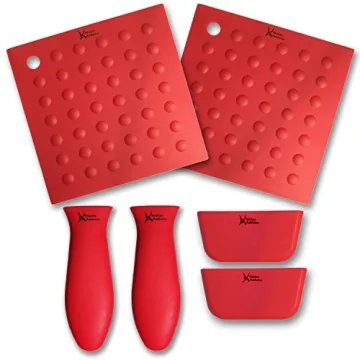 Show moreIntroducing the Kitchen Addiction 6 Piece Silicone Kitchen Set – an essential companion for any culinary enthusiast looking to elevate their kitchen experience! This versatile collection includes two premium silicone trivets and two hot handle holders, each designed to offer peak functionality and convenience. Measuring a generous 7-1/4 x 7 inches, the trivets can handle everything from sizzling skillets to icy water jugs, protecting your countertops and surfaces from heat and scratches while adding a pop of vibrant red color to your kitchen décor.
