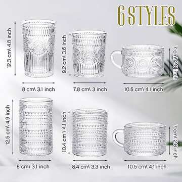 6 Pieces Glass Mugs Vintage Drinking Glasses Embossed Clear Glasses Mugs Juice Water Cocktail Stackable Glass Coffee Cups for Tea Beverage, Dessert, Cereal, Yogurt Glassware Decor