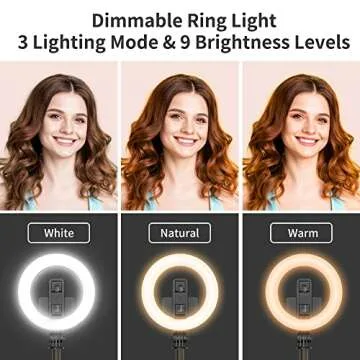 Show more Introducing the 6'' Selfie Ring Light with Tripod Stand & Phone Holder, your ultimate companion for creating stunning content! Designed with versatility and convenience in mind, this portable selfie stick features a rechargeable, dimmable LED ring light that captivates with 3 lighting colors and 9 brightness levels. Whether you're recording beauty tutorials, live streaming, or capturing everyday moments, this ring light ensures that you shine like a star, enhancing the beauty of every subject. The unique arc-shaped lampshade design provides soft, glare-free lighting, making it ideal for any environment.