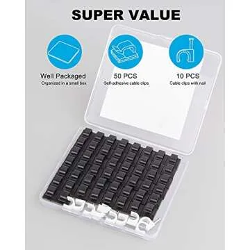 Show more Introducing the ultimate solution for cable management: the Adhesive Cable Clips. Crafted from eco-friendly premium PA66 material, these clips are designed to streamline your cable organization process like never before. With a super sticky back pad, they easily peel off and adhere to a variety of surfaces, ensuring a secure and long-lasting hold. This remarkable package not only includes 50 pcs cable clips but also comes with an additional 10 pcs cable wall clips with nails, making it an unbeatable value for your organizational needs.