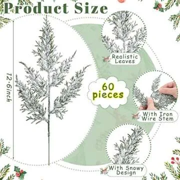 Show moreElevate your holiday décor with our exquisite 60 Pcs Christmas Artificial Faux Cedar Branches, measuring a perfect 12.6 inches in length. Designed to resemble the beauty of real cedar, these branches are adorned with a delicate touch of snow-like flocking, making them an ideal addition to any festive setup. Crafted for those who cherish elegance and aesthetics, these faux branches will seamlessly enhance your Christmas tree, garlands, wreaths, and various centerpieces, ensuring your home radiates warmth and holiday joy.