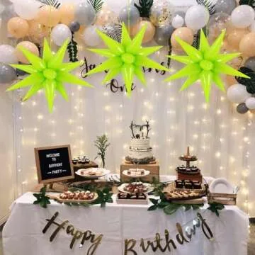 Show moreTransform your celebrations with the enchanting charm of our 60 Pcs Fruit Green Star Balloons! These exquisite foil starburst balloons feature a unique star shape that is sure to leave your guests in awe. With a total of 60 pieces, you can effortlessly assemble 12 cone balloons into a breathtaking exploding star balloon or combine the 5 star balloons to create a stunning centerpiece. Made from premium aluminum film materials, these balloons not only shine with brilliance but also boast an exquisite design that adds a pop of color to any party setting. Unlike other balloons, they are crafted with durability in mind, ensuring they won’t easily leak and can withstand the excitement of your event.