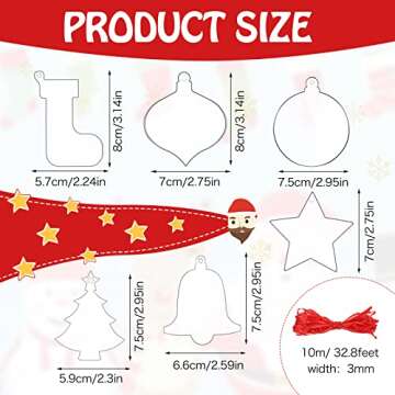 Show moreIntroducing our 61 Pieces Christmas Clear Acrylic Blank Ornament Set that is perfect for adding a personal touch to your holiday decorations! This delightful bundle includes one vibrant red ribbon and sixty pieces of transparent acrylic ornaments, featuring whimsical shapes like bells, Christmas trees, stars, and more. The red ribbon measures an impressive 32.8 feet, allowing you to create stunning displays, while each acrylic disc is a generous 3.5 inches in diameter, making them ideal for any festive crafting project.