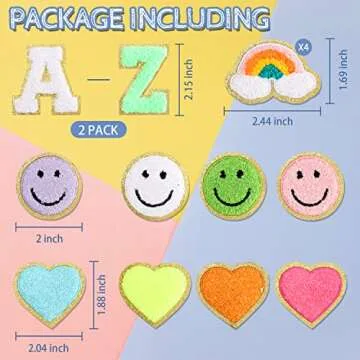 64PCS Adhesive Chenille Letter Patches, 2 Packs A-Z Stick On Varsity Letter Patches Mixed Color Felt Alphabet Stickers Smile Face Love Heart Rainbow Chenille Patches for Clothes Jackets Backpacks Hats