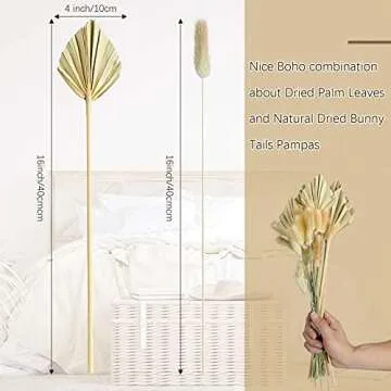 Show more Transform your space into a bohemian paradise with our **66 Pieces Dried Palm Spears Leaves and Dried Bunny Tail Grass Bouquet**. This comprehensive set includes 6 exquisite dried palm leaf spears, each measuring about **16 x 4 inches**, combined with **60 pieces of dried bunny tails** addressing all your decorative desires for home aesthetics, parties, and festive gatherings. Perfectly sized for vase displays, these eye-catching decorations not only enhance the visuals of any arrangement but also serve as engaging conversation starters.