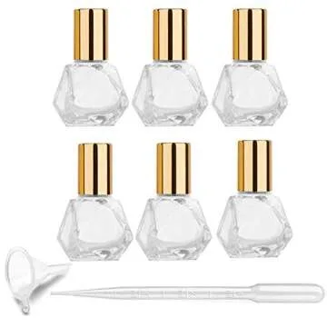 6Pcs 5ml (1/6 oz) DIY Travel Essential Oil Roller Bottle Polygonal Clear Glass Cosmetic Contaners Vials for Essential Oils Perfumes Aromatherapy, 1pc Funnel and Dropper, Roll on Bottles with Gold Cap