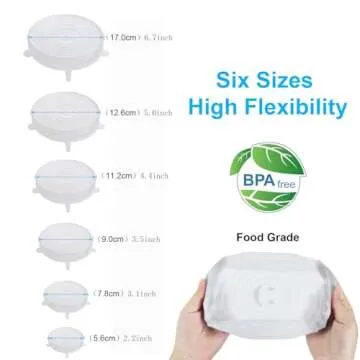 Show more Introducing the ultimate kitchen companion: the OstWony 6PCS Silicone Elastic Fresh-Keeping Cover! These innovative covers are designed to seal your food containers securely thanks to their strong elasticity and robust material. Made from 100% food-grade organic silicone, they ensure complete safety for your food items while enabling easy storage without any spills. With sizes ranging from 2.2 inches to 6.7 inches, these covers are multifunctional, fitting a variety of bowls, cups, jars, and even pots. You'll love the flexibility of these silicone lids, allowing you to stretch and fit them onto various shapes and sizes effortlessly.