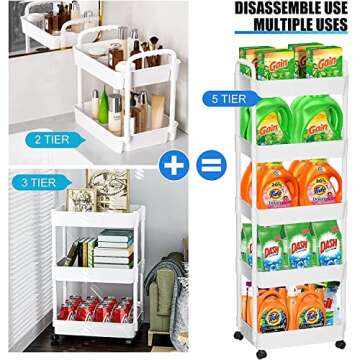 7 code 5-Tier Rolling Cart, Utility Cart with Lockable Wheels, Storage Cart Craft Cart Book Cart Diaper Cart Organizer for Bathroom Kitchen, White