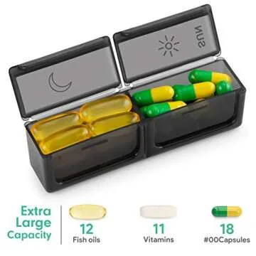 Show moreIntroducing the 7 Day AM PM Pill Organizer from BUG HULL! This large and convenient pill box is designed specifically for those who take multiple vitamins, supplements, or medications daily. With its impressive extra large capacity, each compartment can hold up to 12 fish oils or 11 large vitamins, making it perfect for anyone looking to stay organized with their daily supplements. The sleek, portable design allows you to carry one or more trays in your pocket, making it ideal for travel. No need to worry about the contents, as the dark outer case keeps everything discreetly tucked away, while the high-quality materials ensure long-term usage.