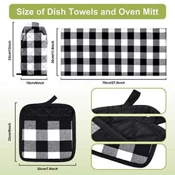In total, the set contains 7 valuable kitchen items: 3 buffalo check dish towels, 2 pot holders, and 2 mitts. With such a variety, you'll find yourself equipped for all your culinary endeavors. The dish towels not only dry your tableware but can also serve as napkins, placemats, or decorative accents on your kitchen counter.