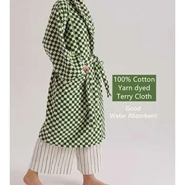 Show more The 7 VEILS Women’s Pure Cotton Yarn Dyed Terry Cloth Bathrobe is the epitome of luxury and comfort. Crafted from 100% premium long fiber cotton, this exquisite bathrobe features a unique yarn-dyed chessboard design that sets it apart from typical printed patterns. Experience the unparalleled fluffiness and softness that this robe offers, along with its strong ductility ensuring a perfect fit over time. Not just aesthetically pleasing, the bathrobe comes in a lovely green hue, guaranteed to brighten up your daily routine without any worry of color fading. It's the ideal companion for relaxing after a soothing shower, a refreshing swim, or even a visit to the spa.