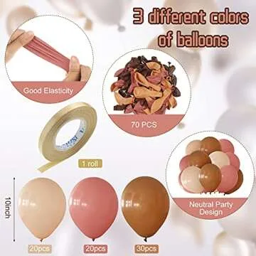 Show moreCelebrate in style with our stunning set of 70 premium latex balloons, the perfect touch to elevate your memorable occasions! This exquisite collection features a harmonious blend of hues—30 elegant cream balloons, 20 charming brown balloons, and 20 delightful dusty rose balloons—each crafted meticulously to complement your event's theme beautifully. Accompanied by a generous 33 feet long gold ribbon, this package is designed to offer a complete decorative solution that infuses warmth and joy into every gathering.