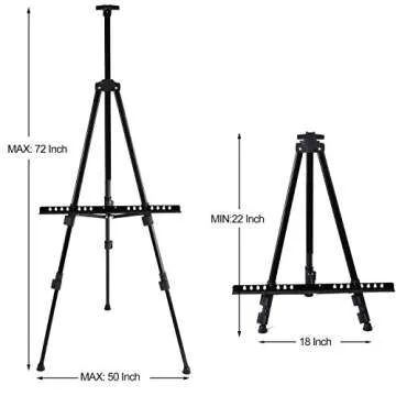 Show moreThe 72 Inches Tall Folding Easel Stand is your perfect companion for displaying art, presentations, or wedding signs! Made from durable aluminum, this adjustable metal tripod easel combines strength with portability, making it an essential tool for artists and event planners alike. With its adjustable height feature that extends from 22 inches to a towering 72 inches, it caters to various display needs, whether you prefer floor standing or tabletop use. Additionally, it accommodates canvas sizes up to 37 inches high and 1.3 inches deep, providing ample space for your creations.