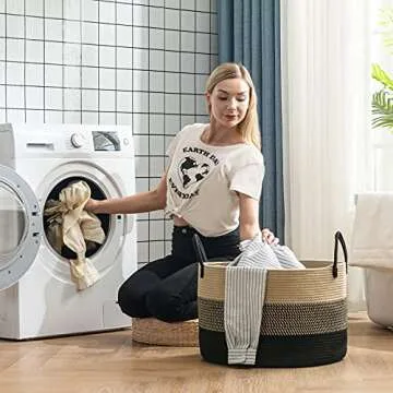 72L Large Woven Rope Laundry Hamper Basket with Handles by YOUDENOVA, 20 x 20 x 13 Round Decorative Blanket Toy Basket for Living room, Black & Jute
