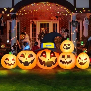 Show moreTransform your Halloween festivities with our stunning 8-foot light-up pumpkin inflatable, complete with a whimsical witch hat and vibrant LED lights. This remarkable visual centerpiece not only creates an eerie yet inviting atmosphere for your yard but also draws the attention of passersby, making it a perfect addition for any Halloween party. Crafted with high-quality waterproof Oxford cloth and durable PVC, this inflatable decoration is built to last, resisting impact and scratches, making it suitable for both indoor and outdoor displays.
