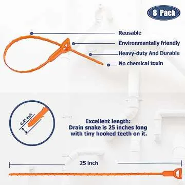Show more Introducing the **8 Pack 25-inch Drain Snake Clog Remover**, an essential tool designed to tackle stubborn clogs and blockages in your plumbing system. This set includes eight flexible yet durable drain snakes that excel in removing hair and other debris from your drains, ensuring that your sinks, bathtubs, and toilets remain free-flowing. Each tool measures a convenient 25 inches in length and is equipped with tiny hooked teeth, crafted from premium PP material that promises both strength and flexibility. Say goodbye to backups in your plumbing with this effective solution!