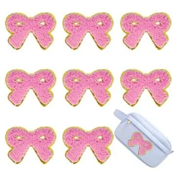 Show moreIntroducing the 8 PCS 2.3 inch Bow Chenille Patches in stunning pink! These delightful self-adhesive fabric patches are designed to add a touch of fun and creativity to your clothing, bags, hats, and more. Made from 100% fully Chenille with exquisite gold edges, these patches not only stand out aesthetically but also boast durability that can withstand the tests of time. Measuring 2 inches in height and 2.3 inches in width, these charming bows are perfectly sized for personalization without overwhelming your accessories.