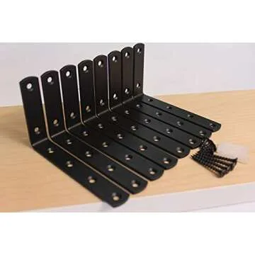 Show more Discover the perfect blend of strength and elegance with our **8 Pcs Steel Heavy Duty L Corner Brace Joint Angle Bracket**. Measuring **125 x 75 mm / 5" x 3"**, these corner brackets are designed to support a maximum weight of **35 lbs** per pair, ensuring your shelves stay secure and reliable. Crafted with precision from durable steel and finished in a gorgeous **matte black powder coat**, these brackets not only provide functionality but also elevate the aesthetic of any space. Ideal for reinforcing **shelves, furniture, or DIY projects**, their robust nature guarantees they can handle even the heaviest loads, making them an essential addition to your toolkit.
