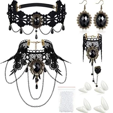 Show moreEmbrace the allure of the night with our **8 Pieces Halloween Vampire Costume Accessory Set**. This exquisite collection blends gothic charm and elegant style, ensuring you stand out at any Halloween gathering. The set includes a captivating retro lace choker, an eye-catching pair of vintage earrings, a chic bracelet with an accompanying ring, and a fashionable hair band. But that’s not all; the centerpiece of this collection is the stunning set of vampire teeth fangs, offered in four varying sizes to provide a fit that feels just right for you. Each piece is designed to enhance your costume, allowing for a truly immersive experience this Halloween.