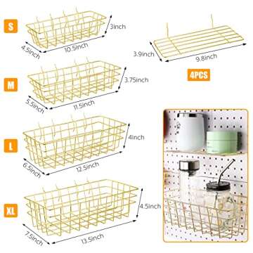 8 Pieces Pegboard Baskets Pegboard Bins Peg Board Racks Wire Peg Board Shelf Wall Organizer Attachments for Organizing Various Tools Workbench Accessories Garage Storage(Gold,S, M, L, XL)