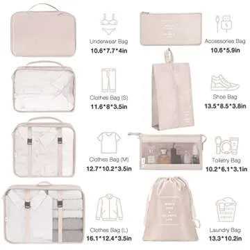 Show more If you're seeking a transformational travel experience, look no further than the incredible 8 Piece Compression Packing Cubes. Crafted with the utmost care, these cubes are designed to make packing a breeze while keeping your belongings perfectly organized. Made from premium quality nylon material, they offer a smooth touch and are waterproof, ensuring your items are shielded from moisture, stains, and wrinkles.