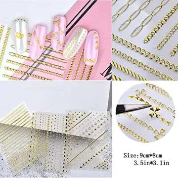 Transform your nail art game with our **8 Sheets Gold Nail Art Stickers**, designed for creativity and flair. Each sheet, measuring 3.5 x 3.1 inches, is packed with a variety of eye-catching patterns, including hearts, chains, waves, and triangles. **These 3D self-adhesive stickers** are incredibly easy to apply—simply peel, stick, and trim them to your desired length! They not only stay vibrant and intact for a long time, but they are also made from eco-friendly materials, making them safe for use even...