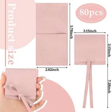 Show more Introducing our range of exquisite microfiber jewelry pouches, designed to meet all your gifting needs. With a total of 80 pieces packed in four elegant colors—pink, beige, khaki, and sand—these pouches are perfect for any occasion where you wish to present small treasures beautifully. Each pouch measures approximately 3.15 x 3.15 inches, making them compact yet versatile for storing an array of small items, from necklaces and bracelets to coins and trinkets.