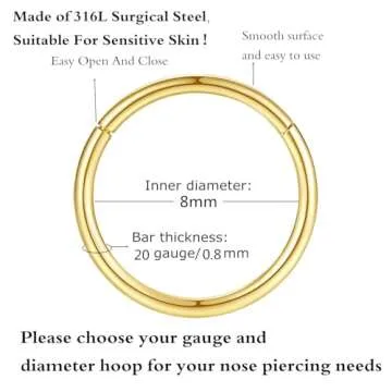 Show moreIntroducing our stunning 8mm Gold Septum Nose Rings, the ultimate accessory for all your piercing needs! Crafted from 316L surgical steel, these nose hoops not only look fabulous but also promise safety and durability for your sensitive skin. The elegant gold finish adds a touch of glam to your style, making it a perfect match for any outfit. These versatile rings are designed to cater to a variety of piercings including nostrils, cartilage, septum, tragus, helix, daith, and even lip and belly rings! With an inner diameter of 5/16 inches (8mm) and a gauge thickness of 20, you will find the ideal fit for your unique anatomy.