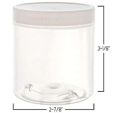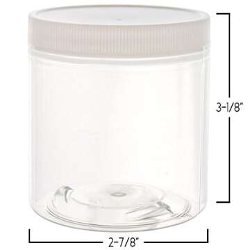 Show more Introducing the perfect solution for all your storage and organizational needs - a set of twelve 8-ounce jars that are not only functional but also stylish. Designed and made in the USA, these jars feature easy-grip, white, screw-on lids ensuring a secure seal for your precious contents. Each jar stands at 3-1/8 inches tall and measures 2-7/8 inches across, providing ample space to store a variety of items.