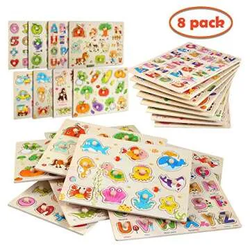 Show more Introducing the 8PACK Wooden Peg Puzzles for Toddlers - a delightful blend of education and entertainment, meticulously crafted to engage young minds. Made from high-quality ultra-thick (0.6cm) wood, these puzzles are not only durable but also safe for children, having passed rigorous certifications like CPSIA and ASTM. Each puzzle features easy-to-grip nails, designed specifically for little hands, ensuring that your children can confidently lift and manipulate each piece as they explore various themes like Transportation, Marine Animals, Numbers, and the Alphabet. The vibrant colors and sweet illustrations provide an inviting way for kids to learn while having fun. With this comprehensive set, your child can develop essential skills such as problem-solving, fine motor abilities, and cognitive awareness in a playful environment.