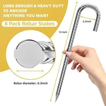 Show moreDiscover the ultimate solution to secure your outdoor investments with the 8PCS Rebar Stakes J Hook Extra Heavy Duty! Designed with the perfect blend of durability and functionality, these 12-inch long ground anchors are perfect for a wide array of uses. With a diameter of 1/4 inch and featuring an upgraded J hook & thread design, these stakes provide exceptional friction with the soil, ensuring they remain securely in place even under tough conditions. The innovative design not only enhances the stability of your trampolines, tents, or garden fences but also streamlines the anchoring process in challenging terrains.
