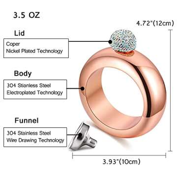 8th Day Fashion Flask Bracelet Bangle for Women 304 Stainless Steel Flask Handmade Crystal Lid Flask Gift Hidden Flask Women Girls Men Party Flask Funnel Set 3.5oz (Rose Gold Crystal)
