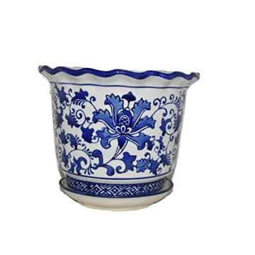 Show moreTransform your living space with the exquisite 9.5" Beautiful Ruffle Scalloped Top Oriental Lotus Flowers & Vine Blue & White Ceramic Planter Pot with Saucer. This stunning planter is adorned with delicate hand-painted designs of lotus flowers intertwined with ornate vines, all set against a pristine white background. The intricate ruffled scallop top adds an elegant touch to the overall aesthetic, making it not only a functional planter but also a captivating piece of art that enhances any decor. Measuring approximately 8.5" tall (with saucer) and 9.5" in diameter, it provides ample space for your favorite plants while contributing to a stunning visual appeal in your home or garden.