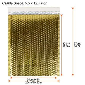 Show more Introducing our exquisite gold bubble mailers, measuring 14.5 x 10.2 inches (usable size: 12.5 x 9.5). Each pack contains 30 beautifully lined mailers, crafted with precision to ensure a seamless shipping experience. Made from high-quality polymer materials, these mailers are designed to provide exceptional protection for your precious packages. The #4 bubble envelopes are built with five layers of polyethylene sheets, offering robust shipping protection that guards against bending and folding of your items.