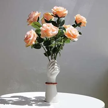 Show more Introducing the 9 Inch Modern Art Ceramic Flower Vase, a stunning tabletop decorations piece designed to add a touch of elegance to any space. This unique vase captures the beauty and grace of a woman's hands, featuring delicate white arms and slender fingers that cradle your favorite floral arrangements. Crafted from high-quality ceramic and utilizing advanced high-temperature technology, this vase stands out not only as a piece of art but also as a practical, easy to clean solution for displaying flowers. Its minimalist aesthetic complements a variety of decor styles and enhances the ambiance of your living room, office, or bedroom.