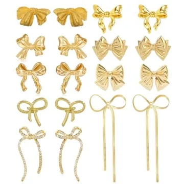 Elevate your jewelry collection with our stunning 9 Pairs Gold Bow Earrings for Women. This exquisite set features a variety of styles, from classic ribbon bows to chic statement pieces, ensuring you have the perfect pair for any outfit. Crafted from high-quality, hypoallergenic alloy, these earrings are not only stylish but also safe for sensitive skin. Their timeless design makes them a versatile accessory that complements any wardrobe, making them a must-have for fashion-forward individuals.