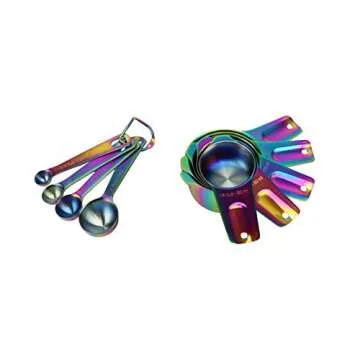 Show moreElevate your cooking experience with the exquisite 9 Piece Stainless Steel Rainbow/Iridescent/Oil Slick Measuring Cup and Spoon Set. Designed to inspire culinary creativity, this enchanting collection seamlessly blends beauty and functionality to make a statement in any kitchen. Crafted from robust, durable stainless steel (0.8mm), this measuring set promises longevity and daily usability, ensuring that it withstands the test of time whether you’re an occasional cook or a culinary enthusiast. The mesmerizing rainbow hues, highlighted by a striking titanium finish, provide a vibrant touch that makes each measuring moment a delight.