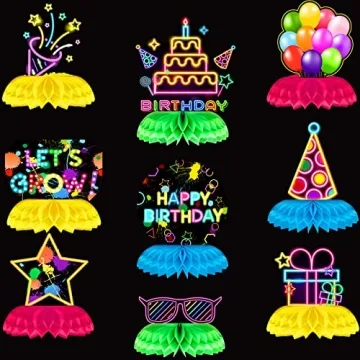 Show moreTransform your party into a vibrant celebration with our **9 Pieces Glow Party Birthday Centerpiece Fluorescent Honeycomb Birthday Decorations**. Crafted to captivate and impress, these delightful tabletop decor pieces encompass a joyous array of elements, including cheerful balloons, festive hats, and whimsical stars, all designed to make your special occasion unforgettable. Each decoration bursts with color under black lights, creating a mesmerizing glow that amplifies the party atmosphere. Perfect for birthday parties, these centerpieces will surely help set a fun and lively tone for your gathering!