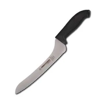 Introducing the **9" Scalloped Offset Sandwich Knife**, your essential kitchen companion designed for both professional chefs and home cooks alike. Featuring a sleek black, ergonomic, and textured **SOFGRIP handle**, this knife is crafted to contour perfectly to your hand, ensuring a comfortable grip even during extensive use. The sharp, durable high carbon steel blade measures 9 inches and is scalloped to facilitate effortless slicing through a variety of breads, providing you with clean, perfect cuts every...
