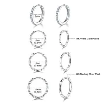 925 Sterling Silver Small Hoop Earrings - 14K White Gold Plated Silver CZ Hoop Earrings | Tiny Endless Huggie CZ Hoop Earring Cartilage Earrings for Women Men(8/10/12mm+8mm)