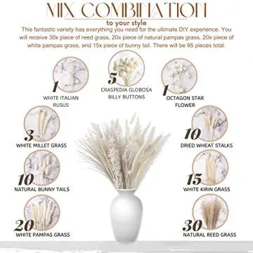Show moreTransform your space with the 95 Stems White Natural Dried Floral Pampas Grass Bouquet, a stunning arrangement that captures the essence of nature’s beauty. This exquisite collection features 20 white dried pampas grass, 30 natural reed grass, 10 bunny tails, 1 white Italian ruscus, 5 wheat stalks, 1 octagon starflower, 15 kirin, 3 millet, 5 craspedia (billy balls), and 5 oryza stevia, perfectly curated to create breathtaking floral centerpieces. Ideal for weddings, special events, or enhancing your home decor, this versatile bouquet offers endless possibilities for DIY projects, bridal bouquets, and table settings, making it an essential addition to any stylish atmosphere.