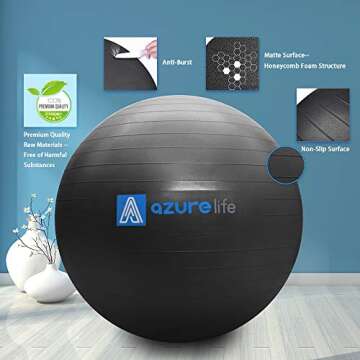 Show more Introducing the A AZURELIFE Professional Grade Exercise Ball, expertly crafted for versatility and durability in exercise and wellness routines. This premium exercise ball is constructed from professional-grade PVC material, ensuring that it's both non-toxic and latex-free, and complies with US California Proposition 65 standards. With a commitment to your health and safety, this exercise ball is not only free from harmful phthalates and heavy metals, but it also features an anti-burst technology that keeps you safe even during the most vigorous workouts. The matte surface and honeycomb foam structure offer a slip-resistant grip, allowing for a secure hold as you strengthen your body and enhance your fitness routine.