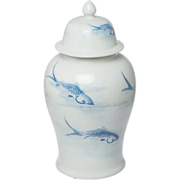 A&B Home Blue & White Porcelain Koi Ginger Jar with Lid,D9.5x19 inch