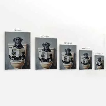 Show more Introducing a delightful addition to your home decor – our canvas print featuring a charming black Labrador sitting on a pristine white toilet reading a newspaper. This whimsical artwork encapsulates humor and elegance, providing a playful yet sophisticated touch to any room. Perfect for dog lovers, this print is a unique way to express your personality and sense of style.