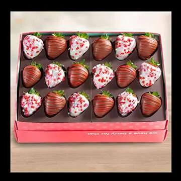 Show moreIndulge in a delightful experience with "A Gift Inside Love Bites Dipped Strawberries". This exquisite gift presents 18 fun-sized strawberries, perfectly dipped in rich milk chocolate and embellished with a vibrant assortment of colorful sprinkles. Each berry is a small bite of joy designed to evoke the sweetness of special moments. Sourced from the freshest strawberries, these delectable treats create a luxurious experience for the palate, making them not just a gift, but a memorable indulgence for any occasion.