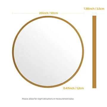 Show more This exquisite 20” gold round mirror is more than just a reflection; it is a fusion of sophistication and functionality that elevates any space it graces. Crafted with a durable gold metal frame and a moisture-proof PVC back panel, this mirror not only offers HD images with crystal-clear reflection but also stands the test of time, ensuring it remains a staple in your décor for years to come. This elegant piece is perfect for those who appreciate quality and aesthetic appeal in their home furnishings.
