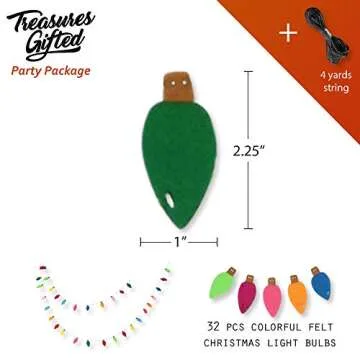 Show more Bring a splash of festive cheer to your holiday gatherings with our vibrant SPARKLY KIT! This delightful package features 32 colorful fabric felt pieces shaped like light bulbs, all artfully assembled on a 12-foot platinum ribbon garland. Each charming neon cut-out measures approximately 2 1/2 inches, offering a perfect blend of whimsy and joy that is sure to capture the essence of the winter holiday season!