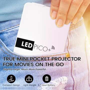 AAXA LED Pico+ MAX Mini Projector, 2.7 Hour Battery, DLP Native 1080P, Wireless Mirroring, Mini-HDMI, Media Player & Speakers, Bluetooth, Micro SD/USB, Pocket Size Portable Movie/Cookie Projector